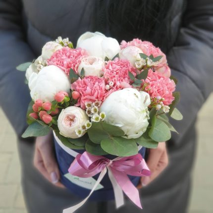 Бархатный цилиндр из голубых диантусов, розовых пионов и ароматной маттиолы