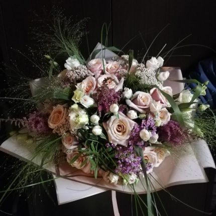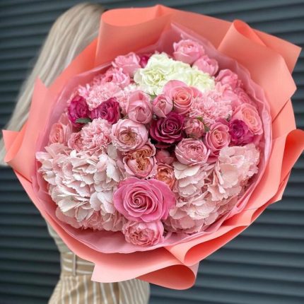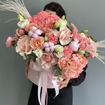 Бархатный цилиндр из голубых диантусов, розовых пионов и ароматной маттиолы