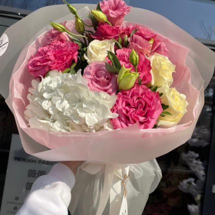 Евро-Букет из Гортензии ,Розовых Роз,Лизиантусов и Эвкалипта + открытка ручной работы в подарок