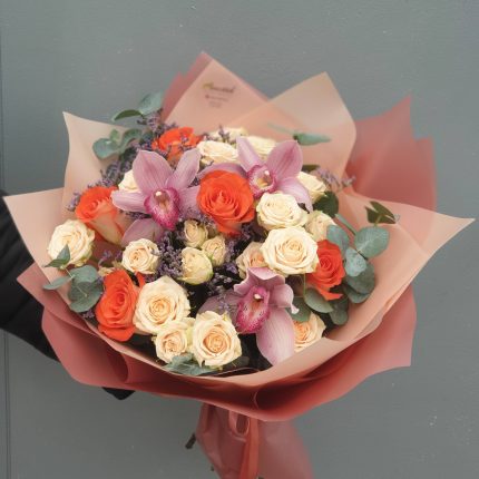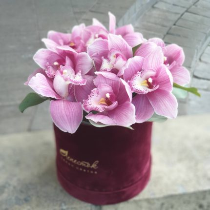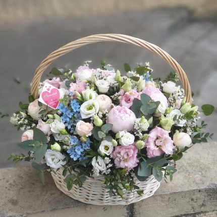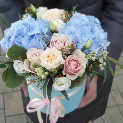 Бархатный цилиндр из голубых диантусов, розовых пионов и ароматной маттиолы