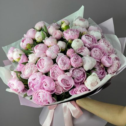 Букет из 7 шоколадных пионов оранжево-сиреневых в дизайнерском картоне