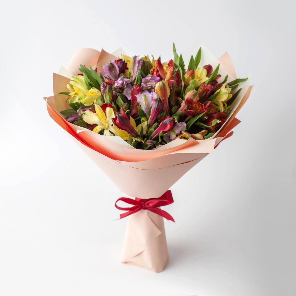 Упаковка – 1 шт.Атласная лента – 1 шт.альстромерия микс – 15 шт.