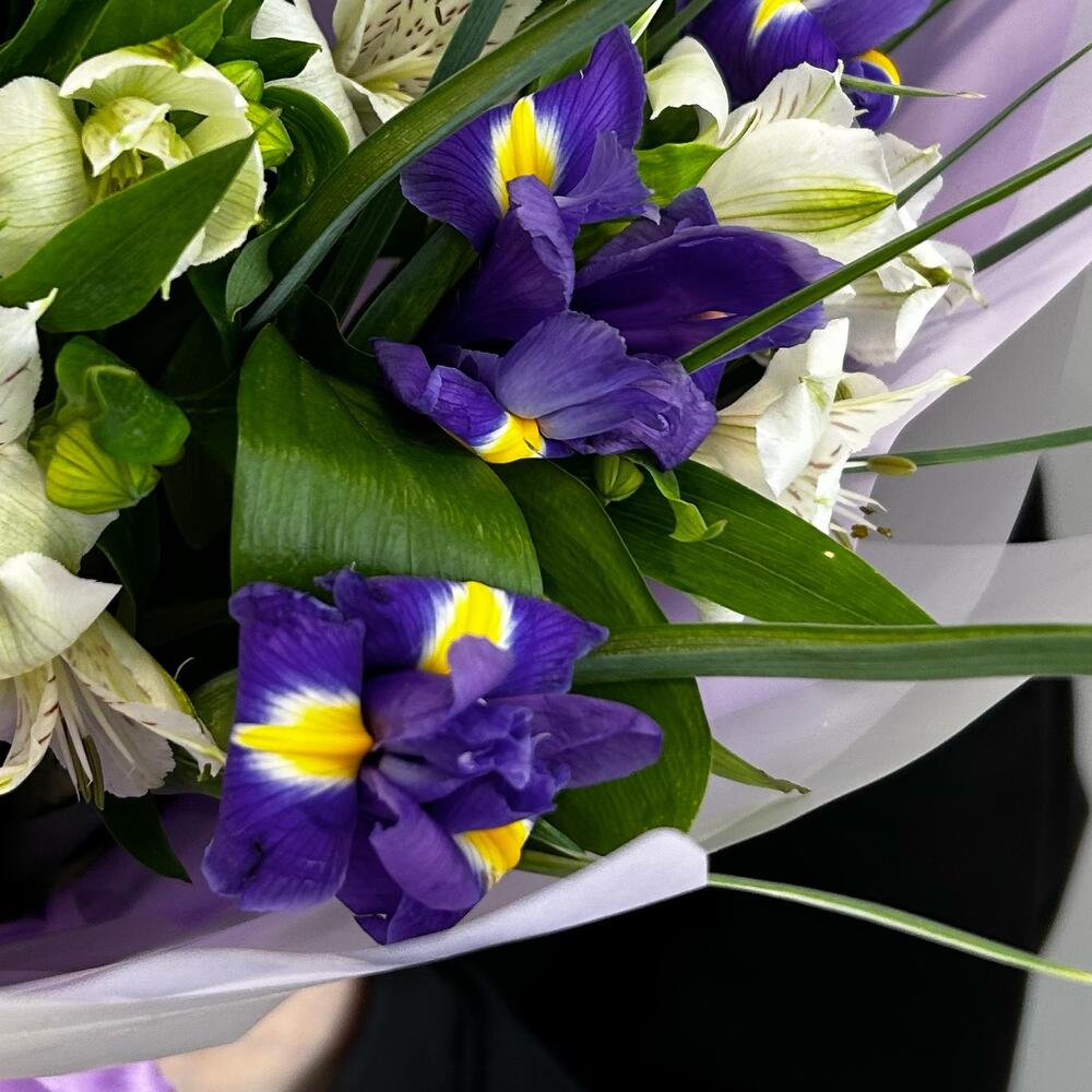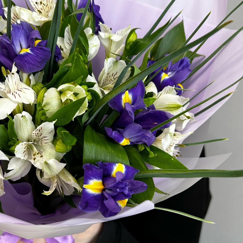 Альстромерия – 6 шт.Ирис – 7 шт.Зелень – 2 шт.Упаковка дизайнерская – 2 шт.Лента атласная – 2 шт.