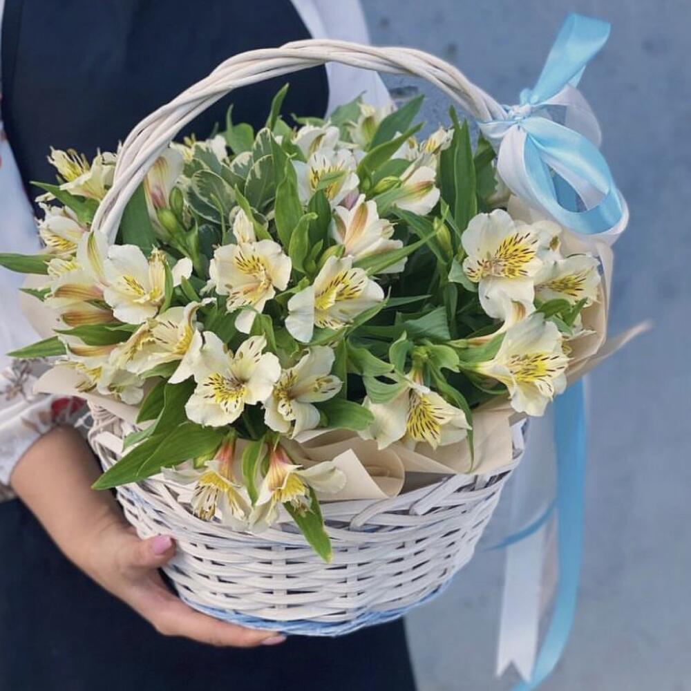 Альстромерия – 9 шт.Корзина – 1 шт.Лента атласная – 1 шт.Тишью – 2 шт.Оазис флористический – 1 шт.пленка транспортировочная – 1 шт.работа флориста – 1 шт.