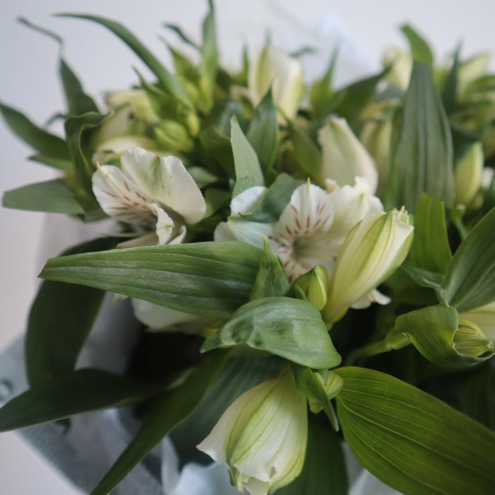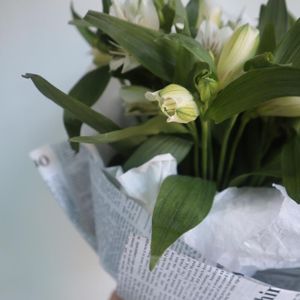 Альстромерия белая – 9 шт.Тишью белое – 2 шт.Крафт газета – 2 шт.Рафия – 1 шт.