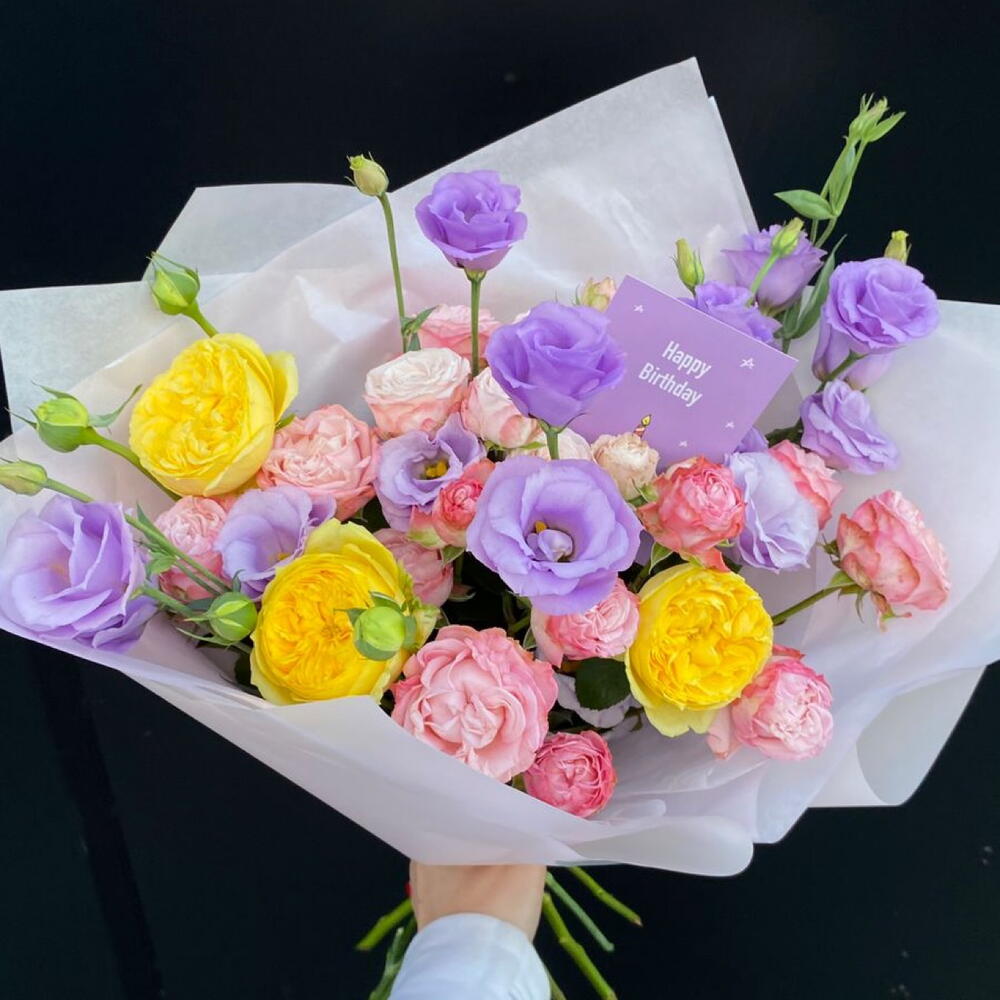 Гвоздики, Лизиантусы, Розы, Тюльпаны