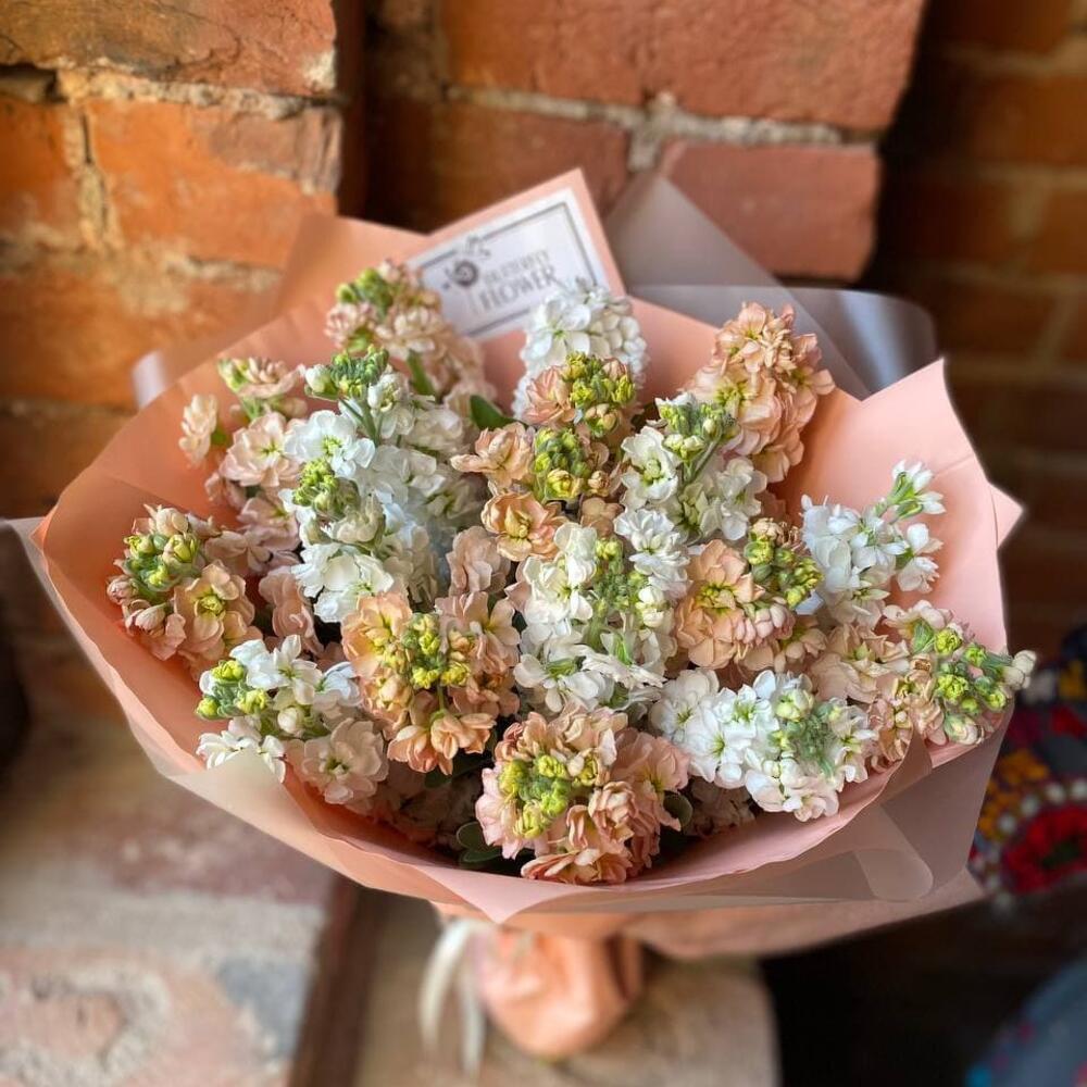 Букет из 17 белых и персиковых маттиол в дизайнерской упаковке