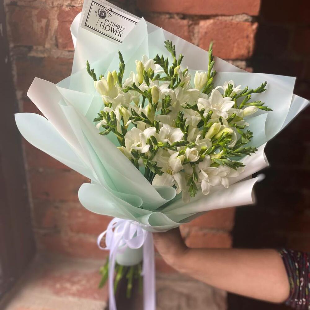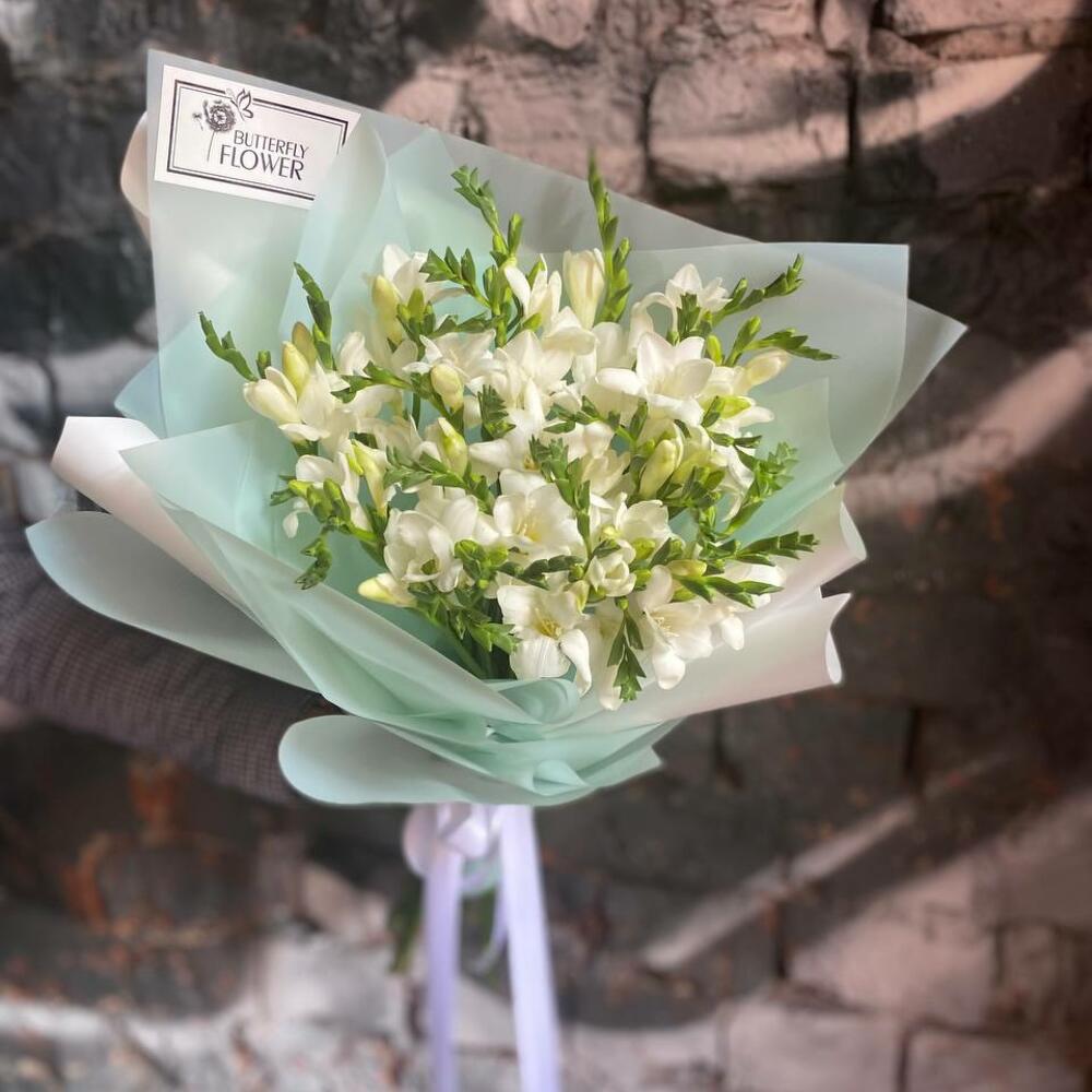 Букет из 27 белых фрезий в стильной упаковке “Перт”