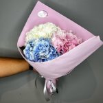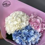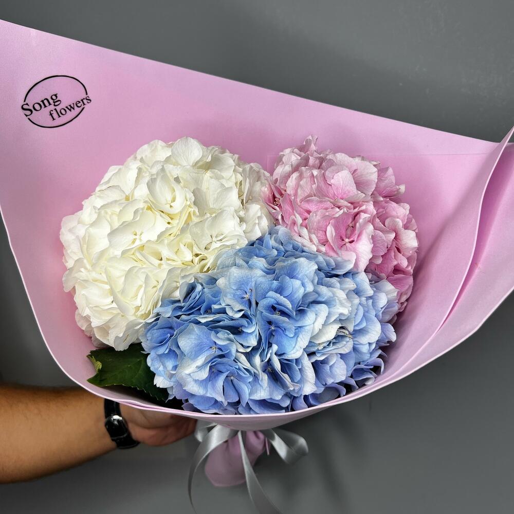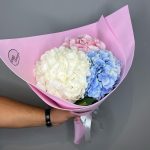 Букет из голубой гортензии, пионов и пионовидных роз