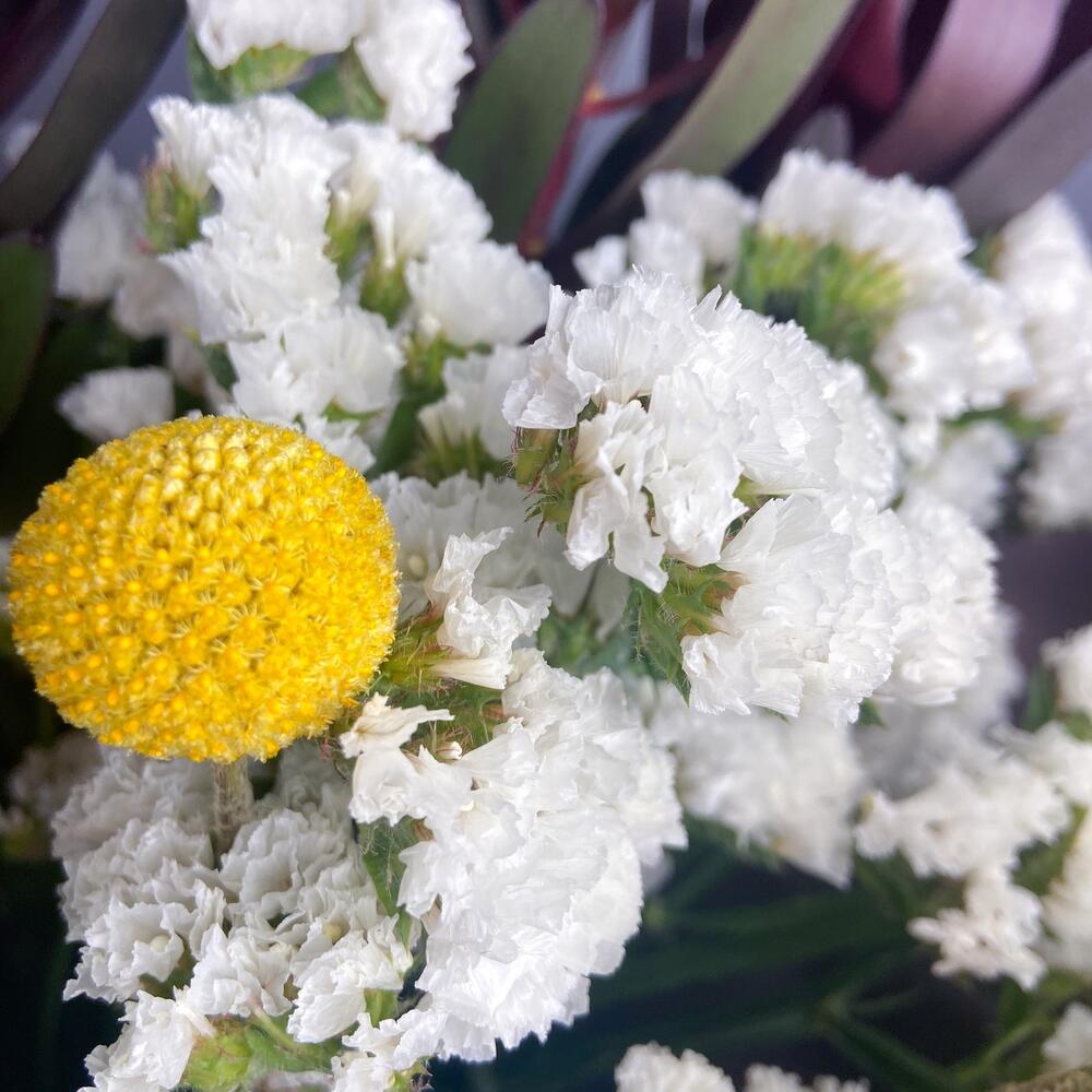 Невероятно стойкий и необычный букет из экзотического сафари,невероятно стойкий белой статица и милыми желтыми шариками краспедии-удивит и восхитит свою получательницу!