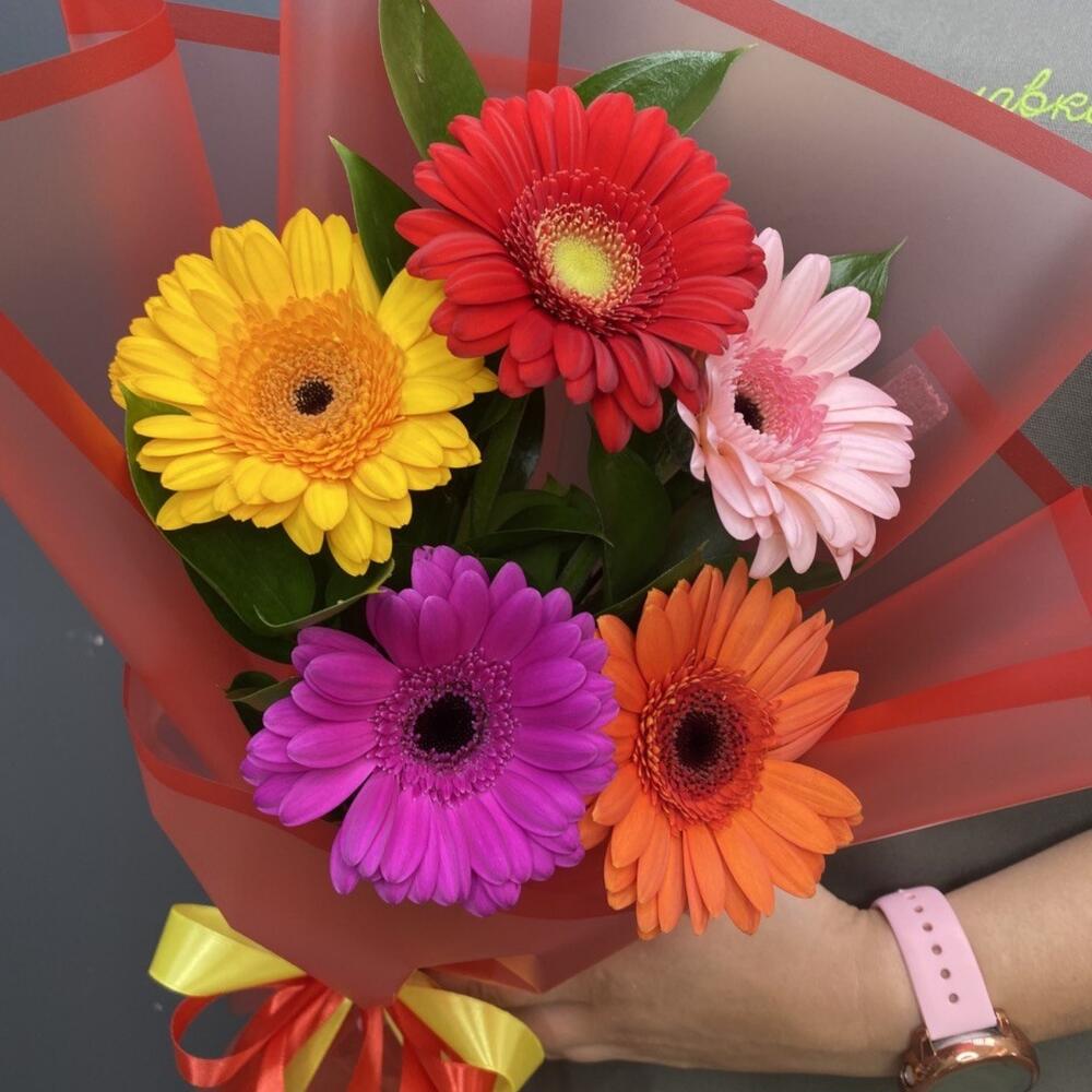 Рускус – 6 шт.Лента атласная – 1 шт.Гербера мини – 5 шт.Упаковка дизайнерская – 1 шт.