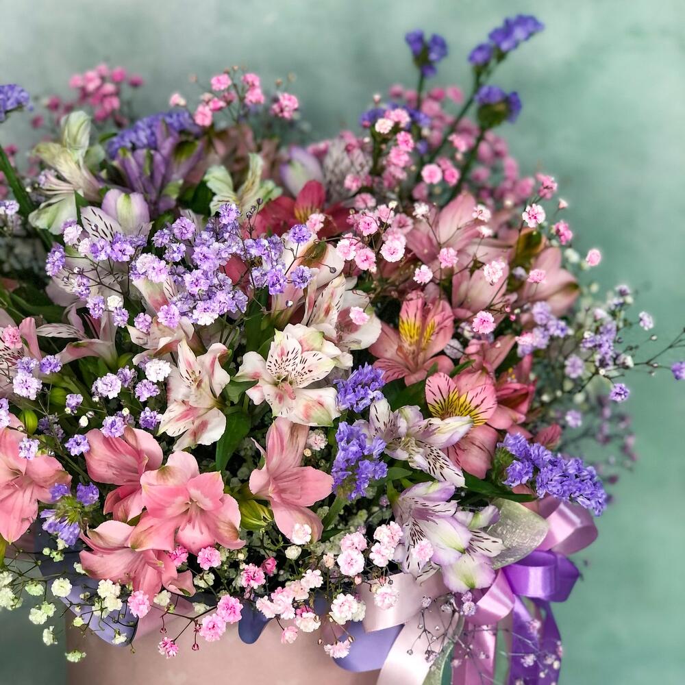 Альстромерия – 18 шт.гипсофила радужная – 6 шт.Статица – 2 шт.Коробка шляпная – 1 шт.Оазис флористический – 2 шт.ленты атласные – 4 шт.