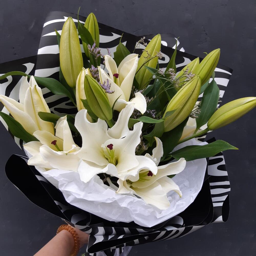 Лилия белая – 5 шт.лимониум или гипсофила или статица – 2 шт.Упаковка дизайнерская – 2 шт.Лента атласная – 1 шт.