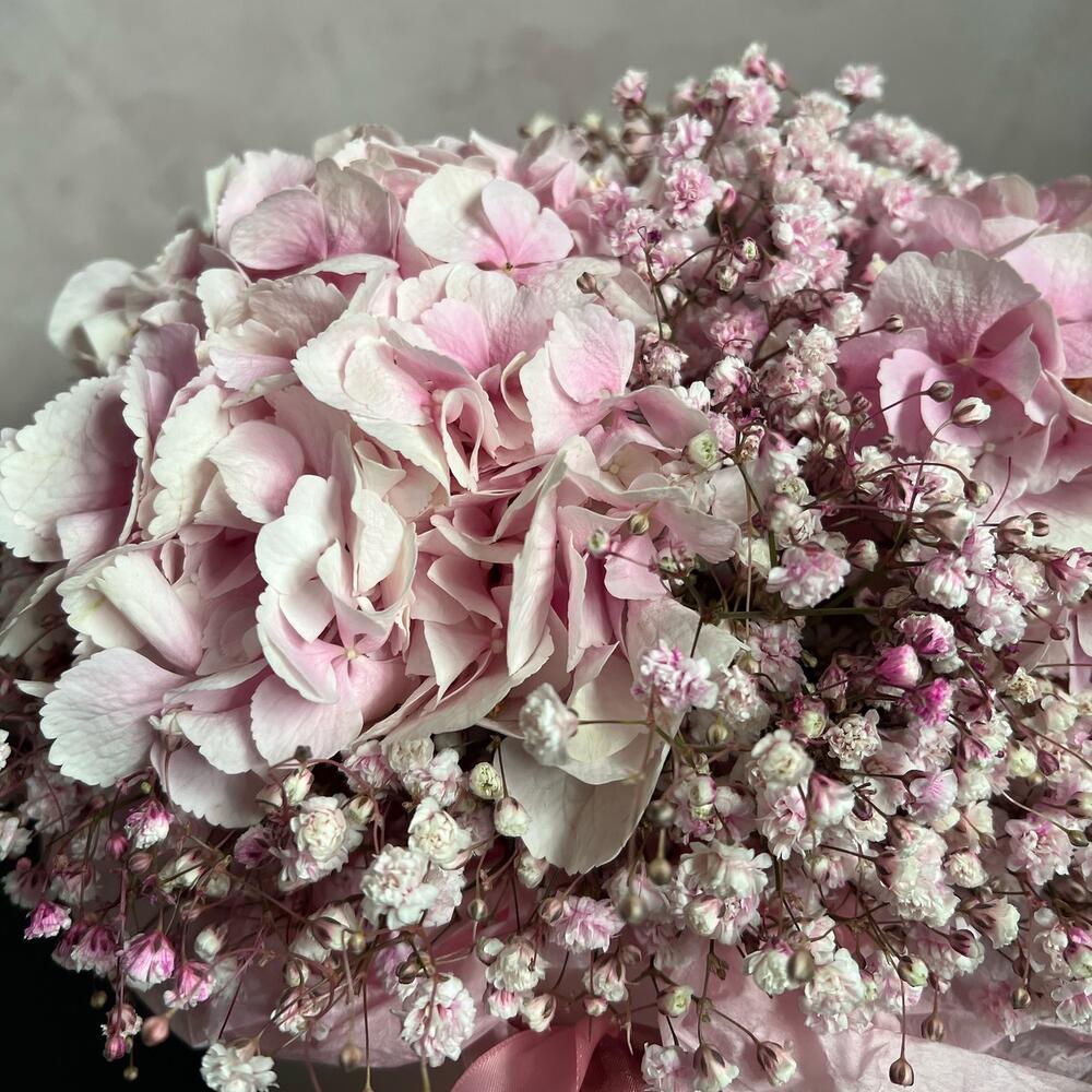 шляпная коробочка l – 1 шт.Флористическая губка (оазис) – 1 шт.Тишью – 1 шт.Атласная лента – 1 шт.Гортензия – 3 шт.Гипсофила – 7 шт.