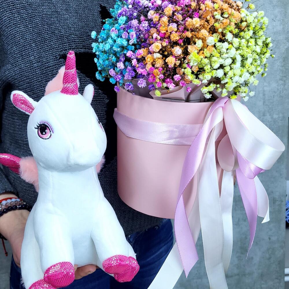 Единорог Лизонька со стаканчиком белоснежной гипсофилы