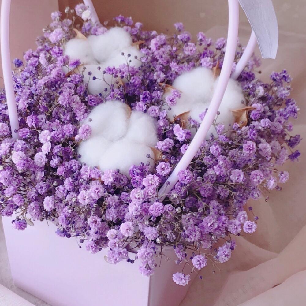 Хлопок – 3 шт.Лента атласная – 1 шт.Сумочка – 1 шт.Флористическая губка – 1 шт.Гипсофила фиолетовая – 3 шт.