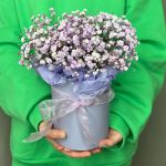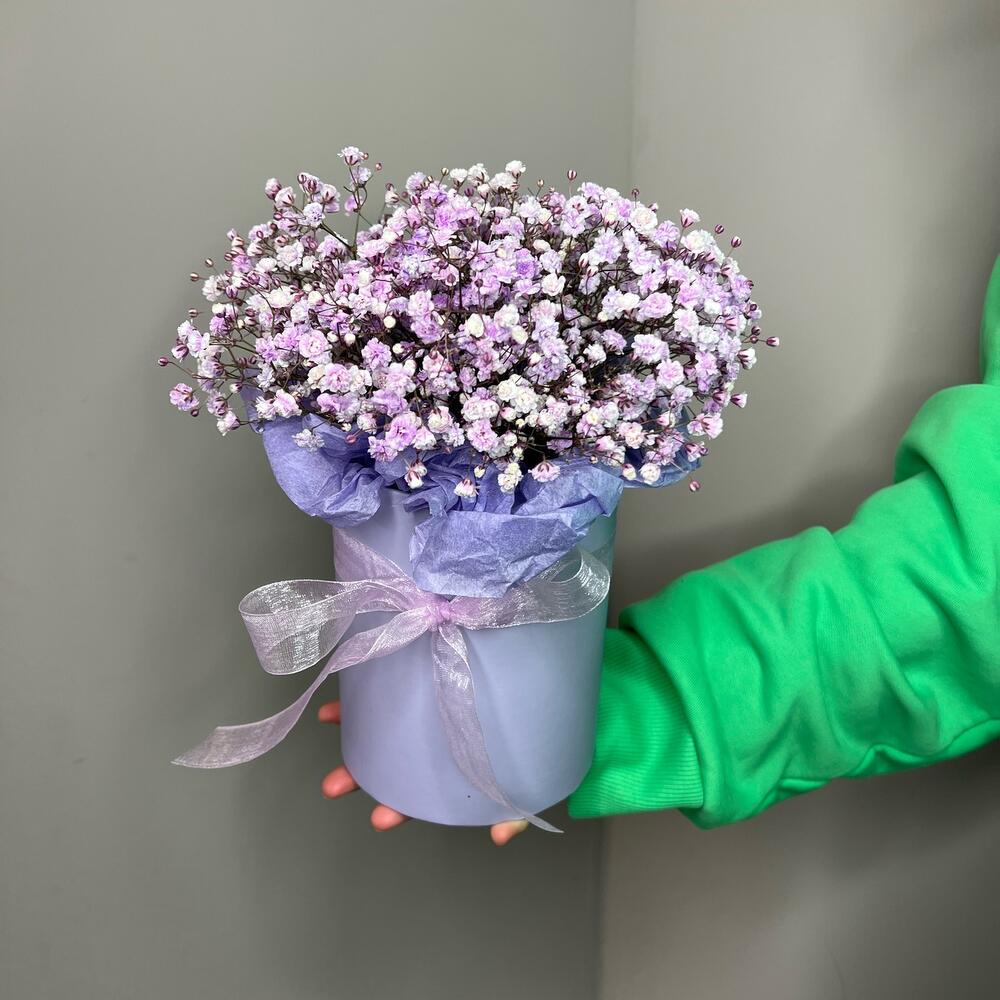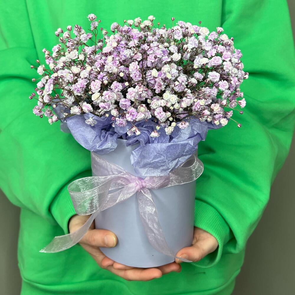 “Сиреневый туман” – композиция из гипсофилы в шляпной коробке