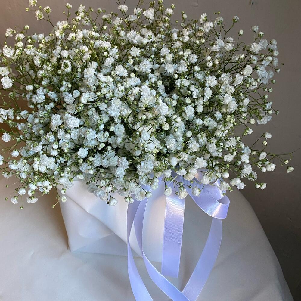 гипсофила белая – 5 шт.Упаковка дизайнерская – 2 шт.Лента атласная – 2 шт.открытка для пожеланий – 1 шт.