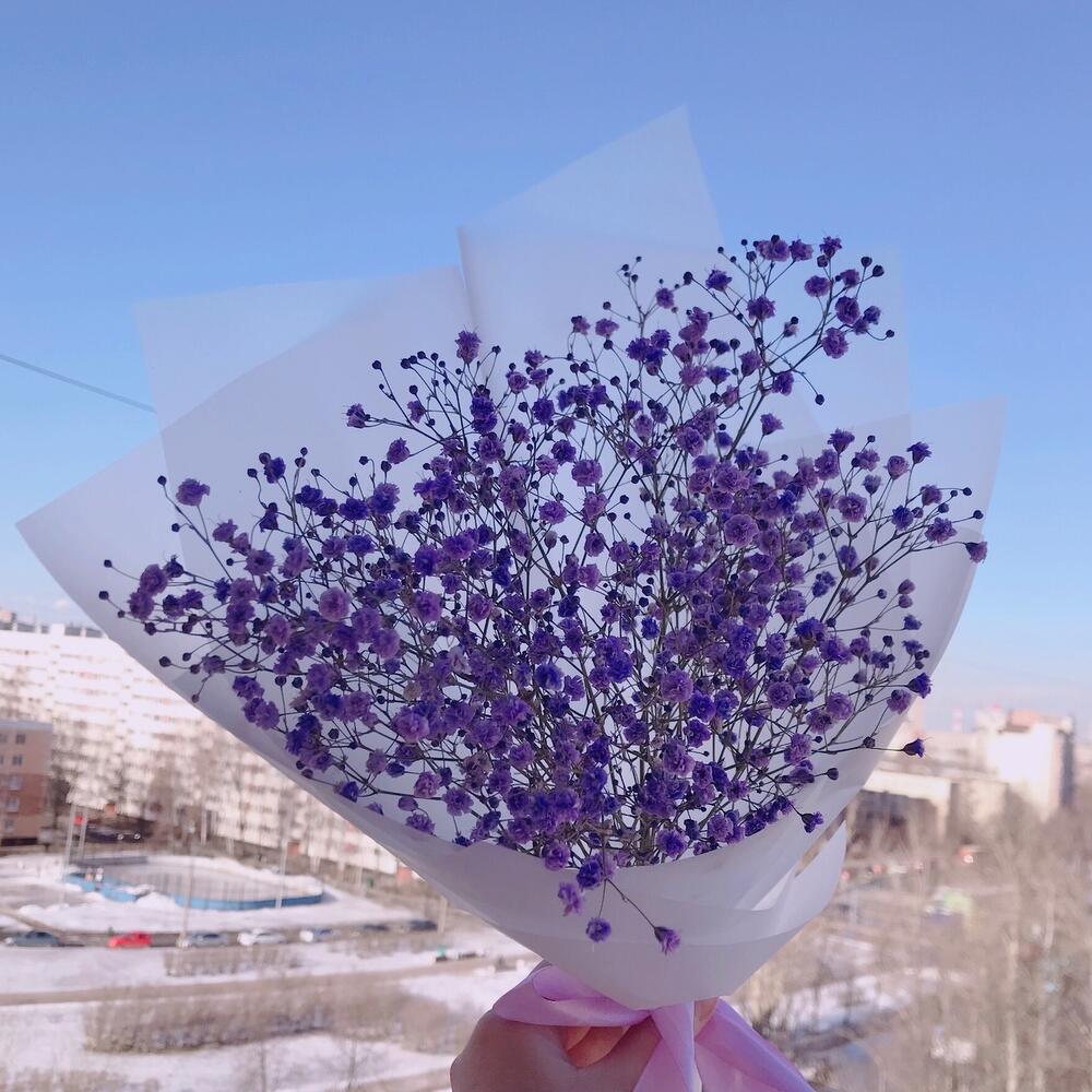 Лента атласная – 1 шт.Упаковка дизайнерская – 1 шт.Гипсофила фиолетовая – 1 шт.