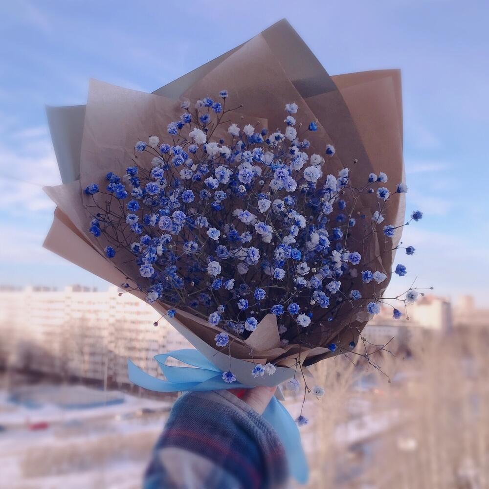 Лента атласная – 1 шт.Упаковка дизайнерская – 1 шт.Гипсофила голубая – 1 шт.