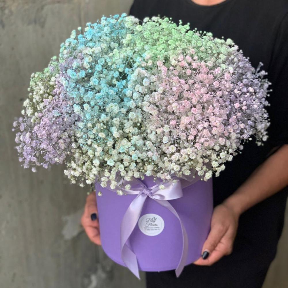 “Сиреневый туман” – композиция из гипсофилы в шляпной коробке
