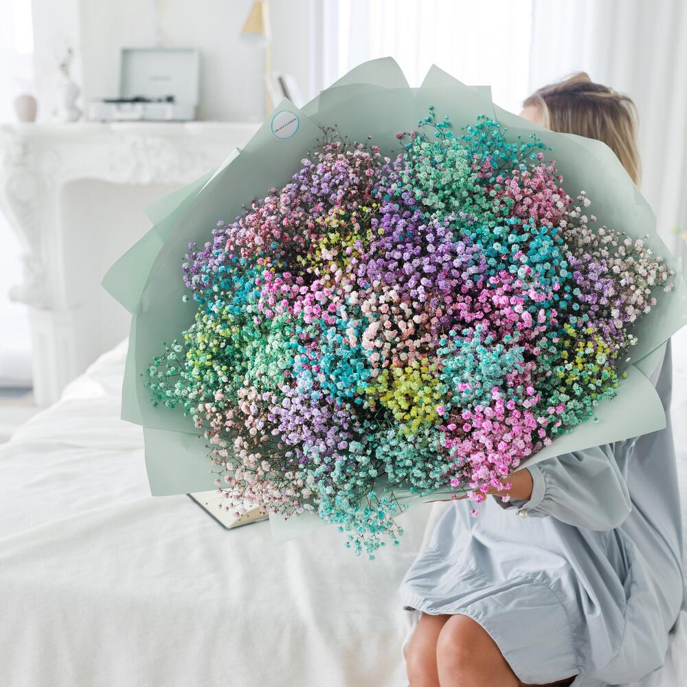 Радужный букет с гипсофилой