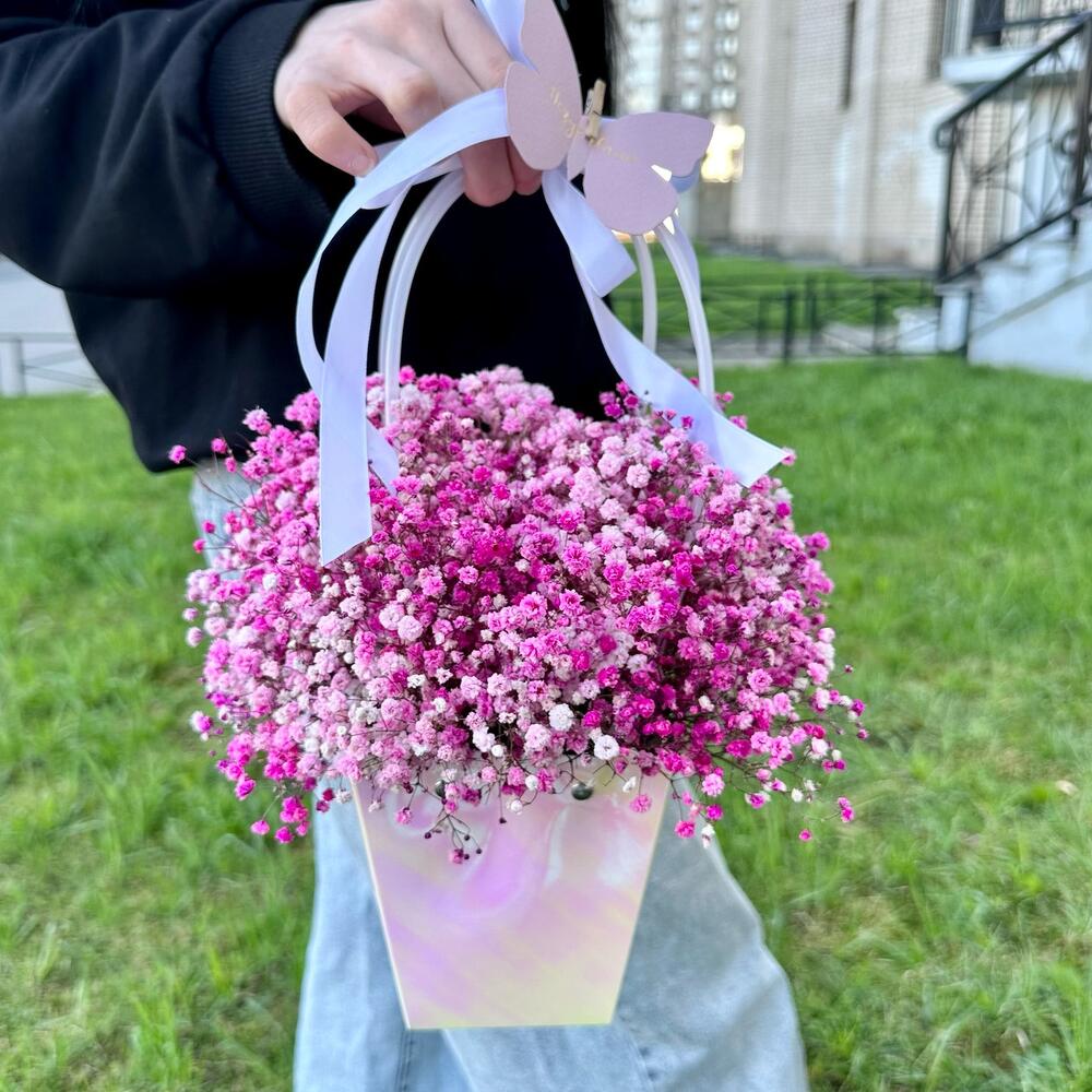 Гипсофила – 7 шт.Лента атласная – 1 шт.Сумочка – 1 шт.Открыточка с вашими пожеланиями – 1 шт.