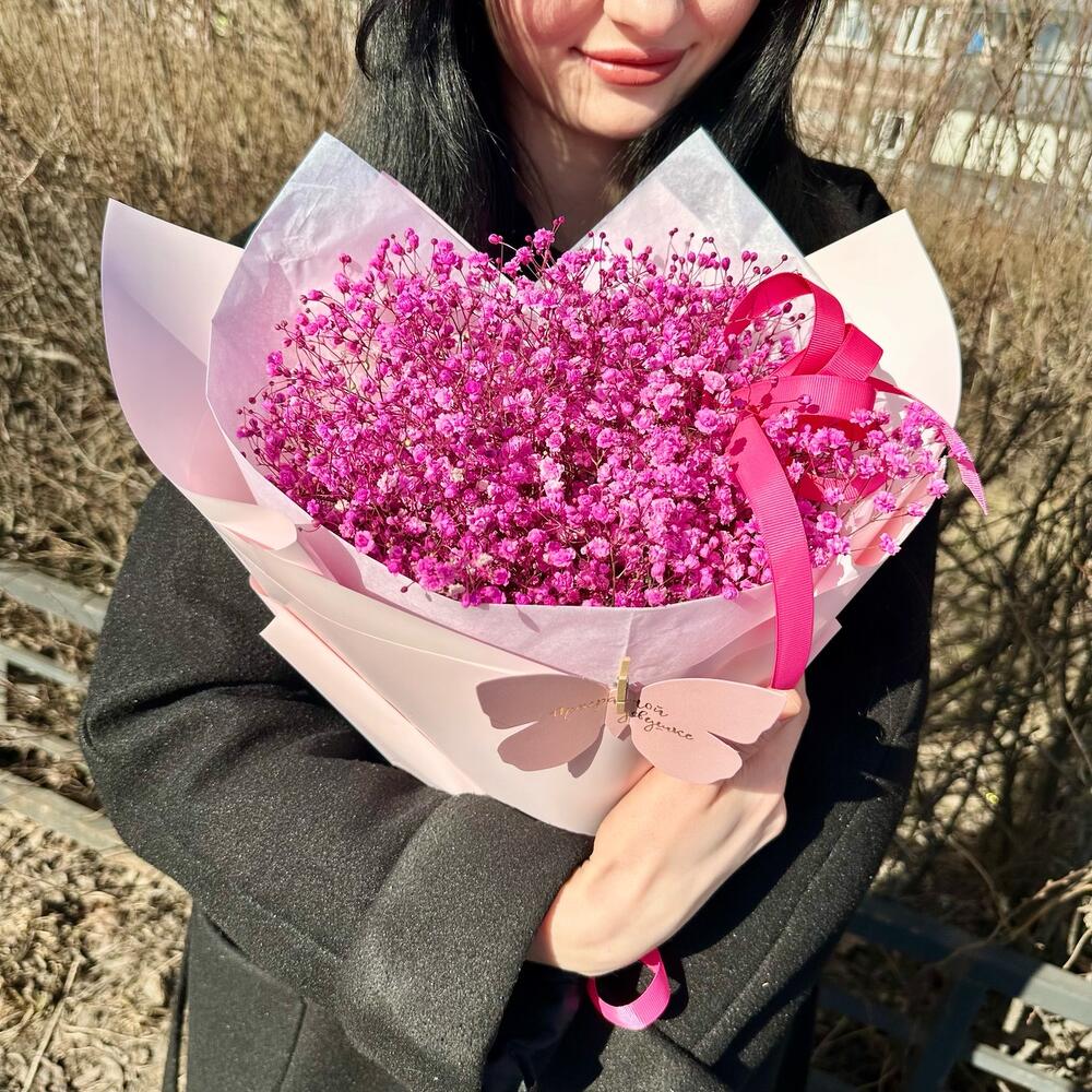 Лента атласная – 1 шт.Тишью – 1 шт.Пленка матовая – 1 шт.Открыточка с вашими пожеланиями – 1 шт.Гипсофила розовая – 7 шт.