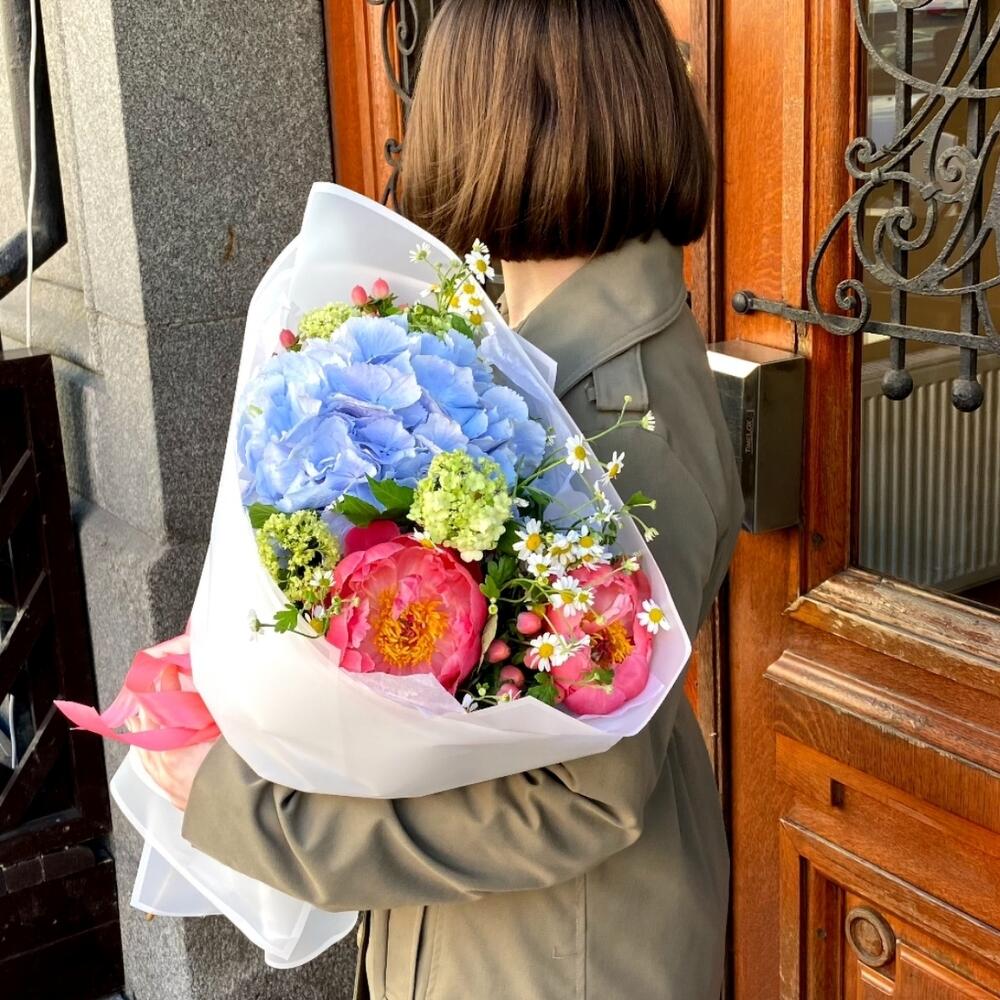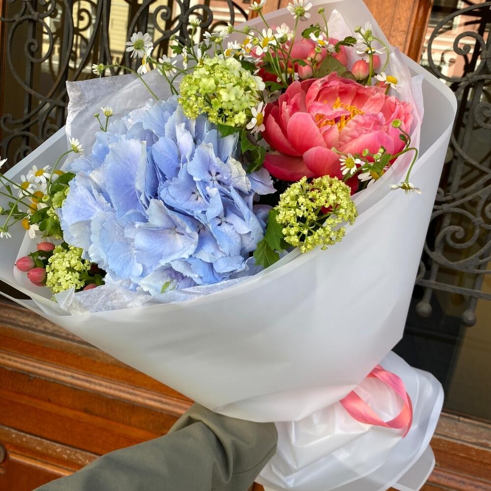 Премиум весенний букет с гортензией, пионами, вибурнумом