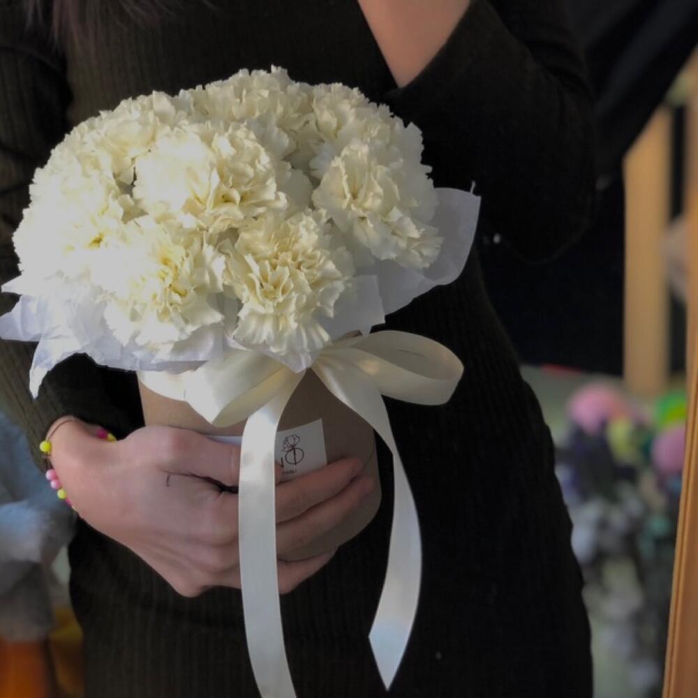 11 белых гвоздик в шляпной коробке