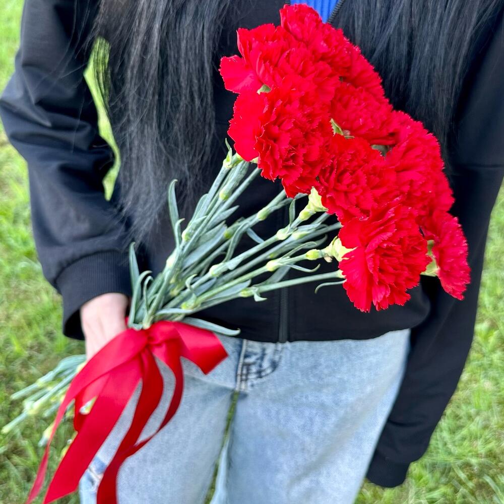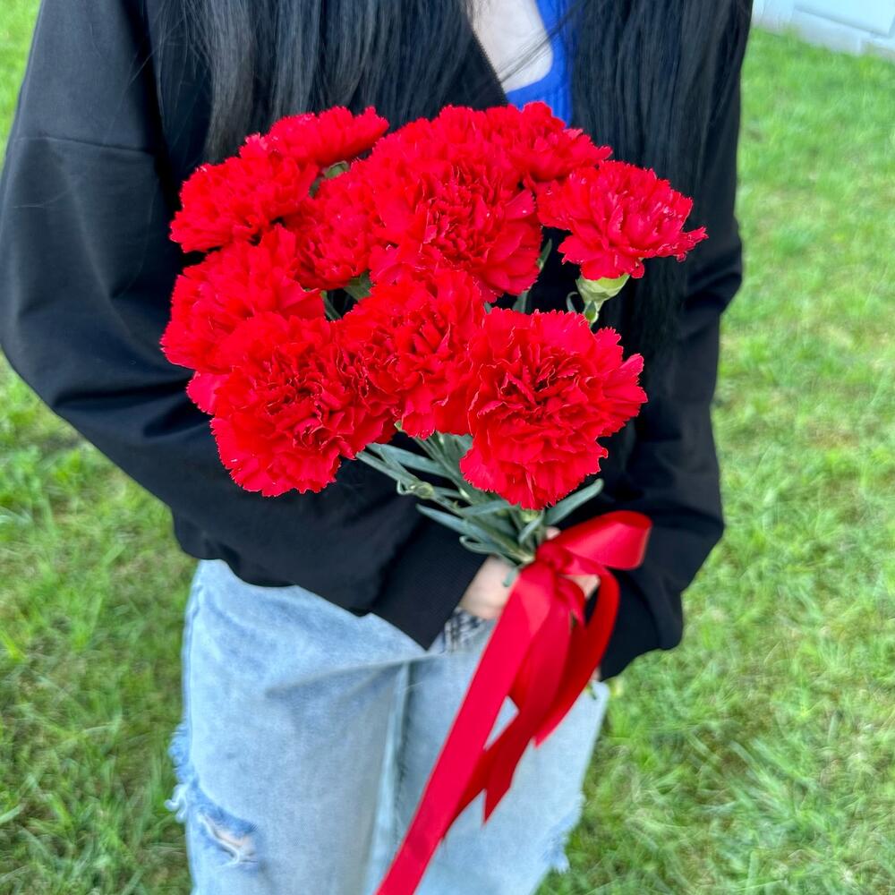 Лента атласная – 1 шт.Гвоздика красная – 11 шт.Открыточка с вашими пожеланиями – 1 шт.