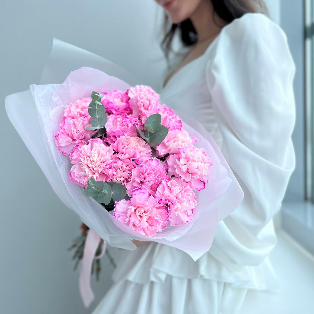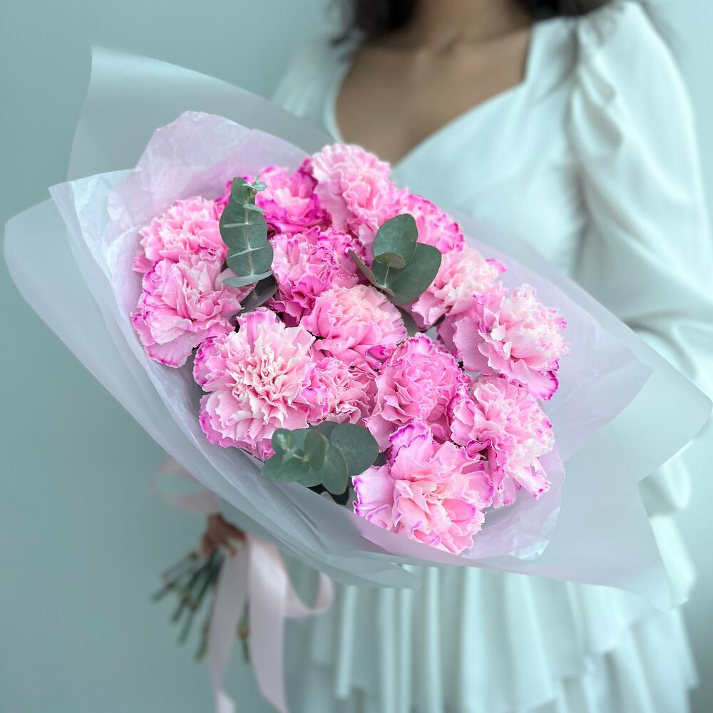 15 ярко-розовых гвоздик с эвкалиптом (букет N 45)
