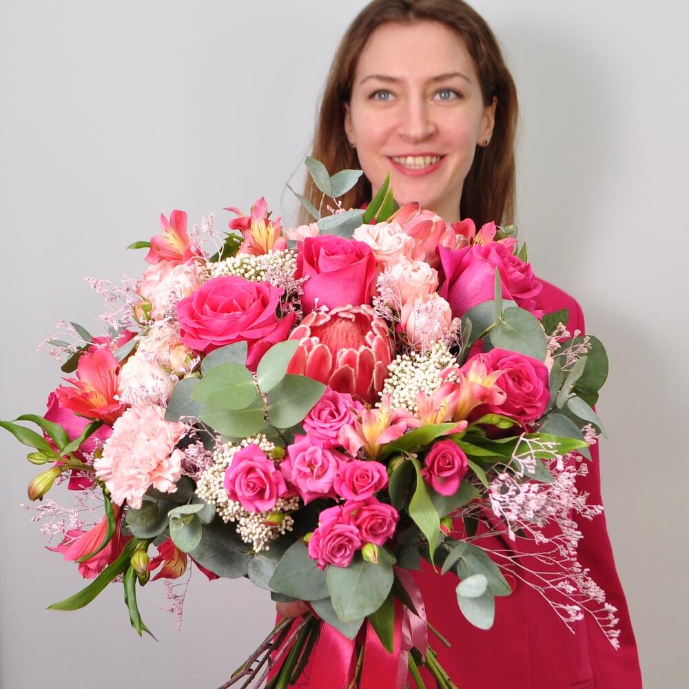Альстромерия – 7 шт.Озотамнус – 5 шт.Протея – 2 шт.Эвкалипт – 2 шт.Гвоздика – 3 шт.Роза кустовая пионовидная – 6 шт.Роза – 5 шт.