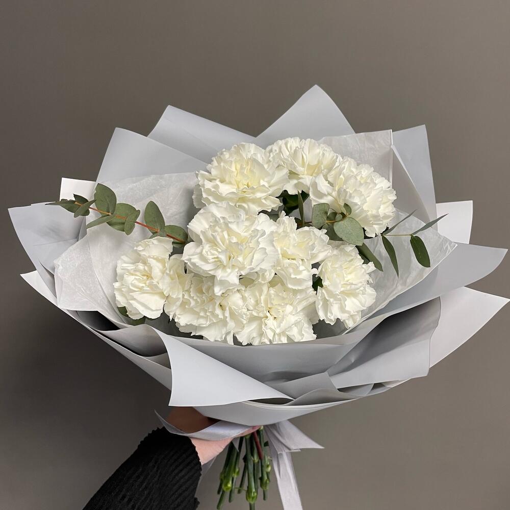 Эвкалипт – 3 шт.Тишью – 2 шт.Пленка матовая – 2 шт.Диантус белый – 9 шт.