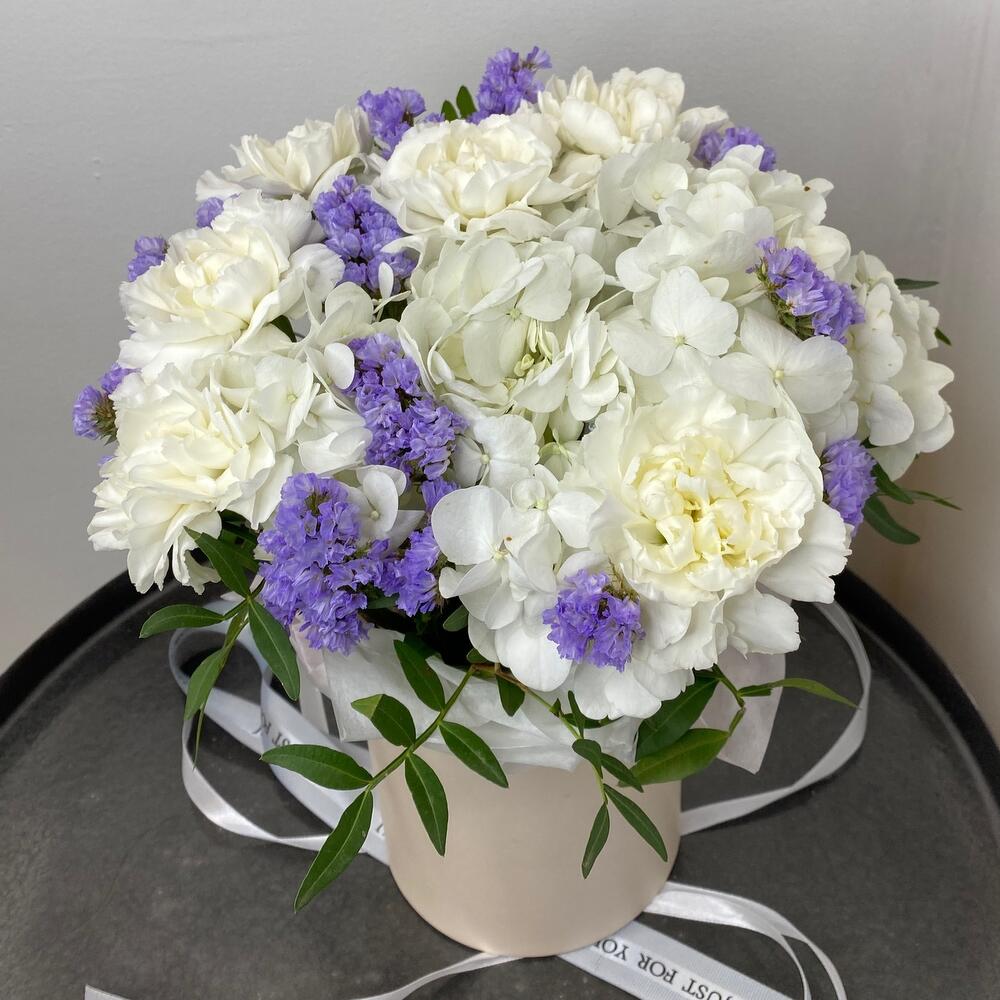 Гортензия – 1 шт.Статица – 2 шт.Тишью – 1 шт.Коробка шляпная – 1 шт.Пистакия – 2 шт.Оазис флористический – 1 шт.диантусы – 6 шт.