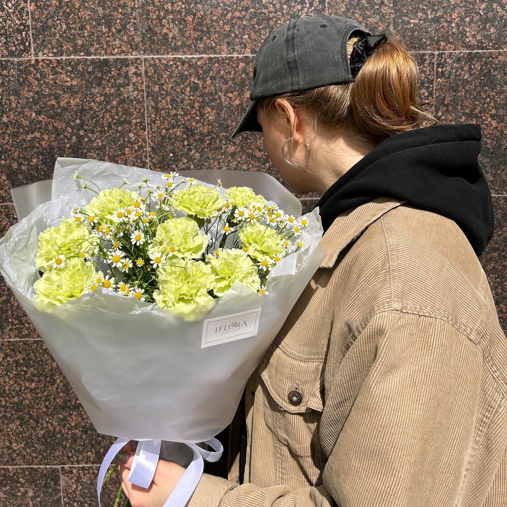 Диантус – 9 шт.Танацетум – 4 шт.Фисташка – 2 шт.Дизайнерская упаковка – 1 шт.
