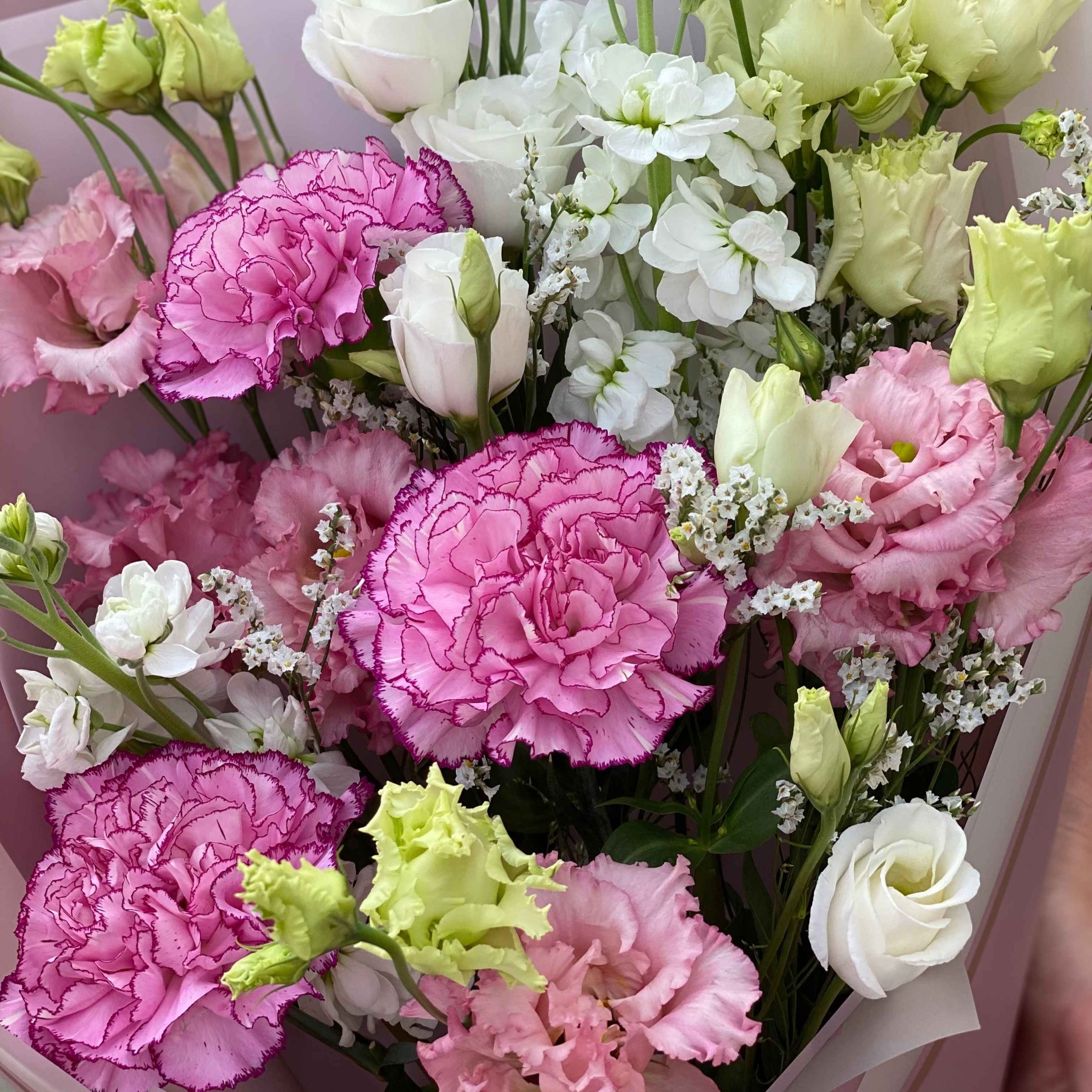 Альстромерии, Гвоздики, Кустовые розы, Лизиантусы, Розы, Хризантемы