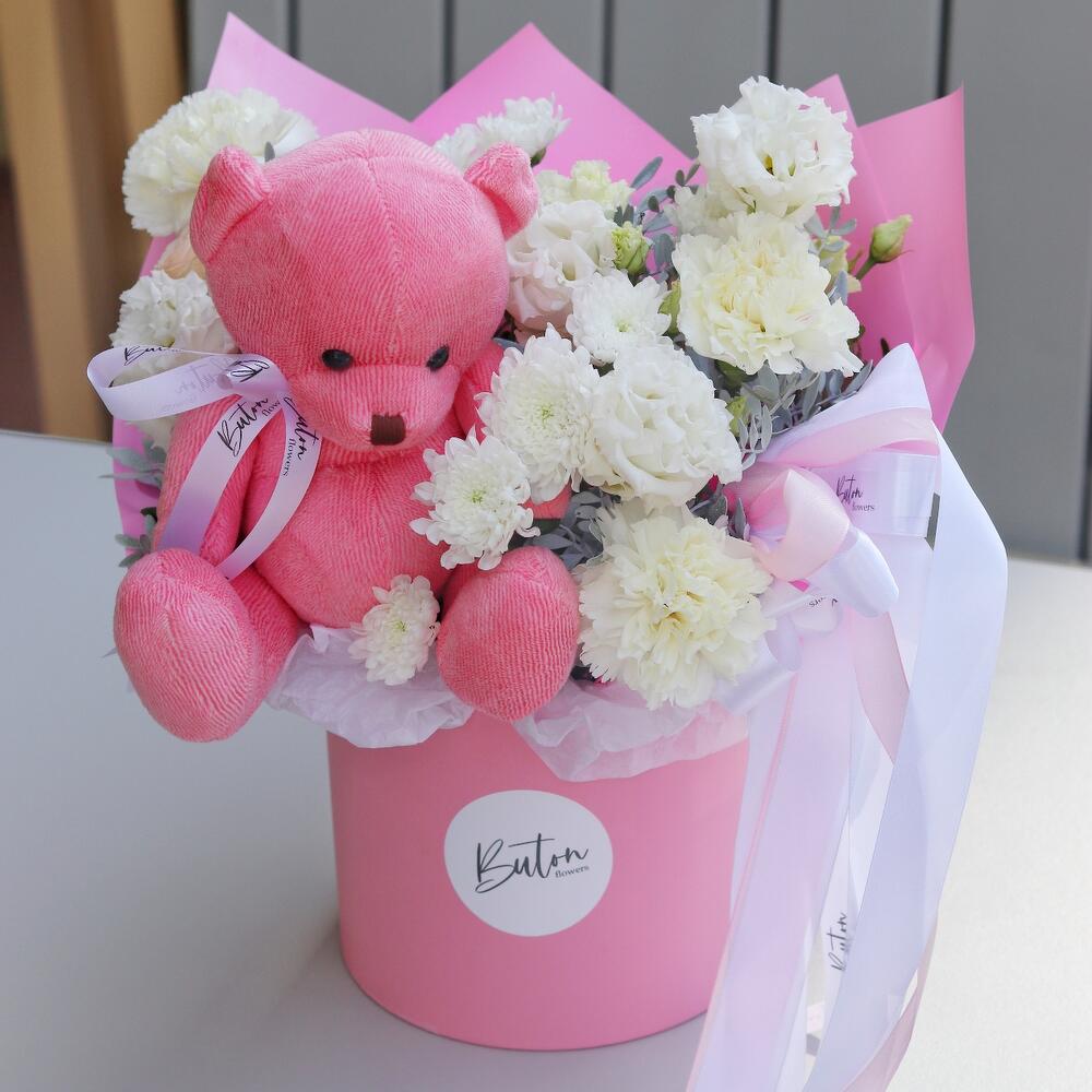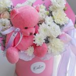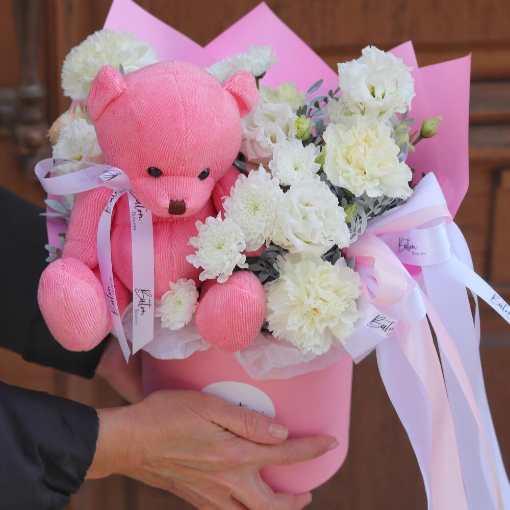 Цветы в коробке с мишкой “Аврора”
