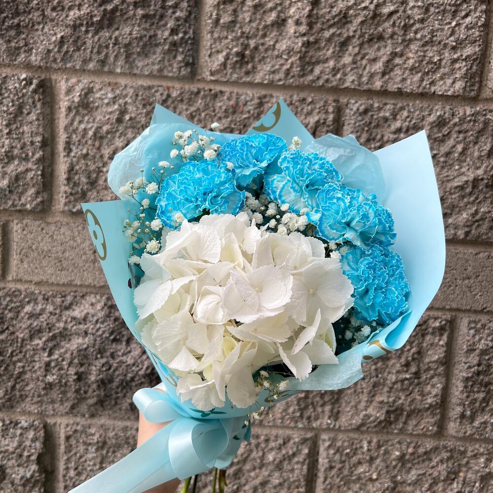Гортензия – 1 шт.Диантус – 5 шт.Гипсофила – 2 шт.Упаковка дизайнерская – 4 шт.Лента атласная – 2 шт.