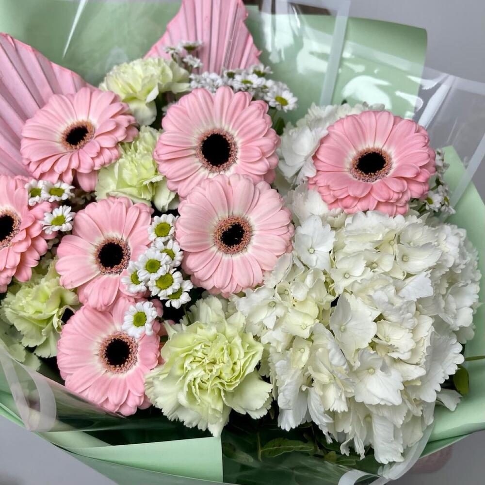 Гермини – 7 шт.Гортензия – 1 шт.Диантус – 4 шт.Сантини – 5 шт.Листья пальмы – 2 шт.Упаковка дизайнерская – 4 шт.Фисташка – 5 шт.
