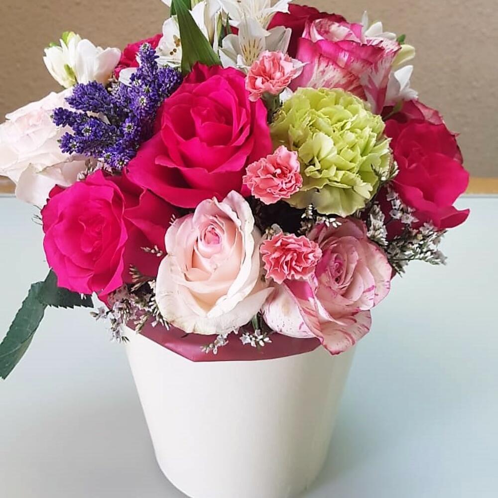 Роза Эквадор – 6 шт.Роза кустовая – 2 шт.Альстромерия – 4 шт.Гвоздика – 2 шт.Капс – 2 шт.Коробка – 1 шт.