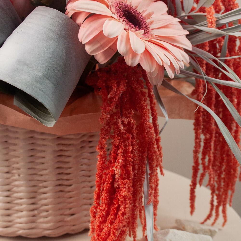 Корзина – 1 шт. Альстромерия – 2 шт. Амарант – 1 шт. Аспидистра – 2 шт. Гвоздика одноголовая – 3 шт. Гербера – 2 шт. Оазис – 1 шт. пальмовое копье – 1 шт. пампас мини – 2 шт. Фисташка – 1 шт.