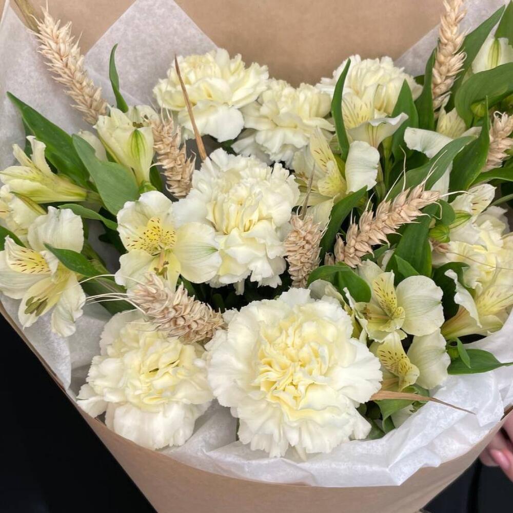 Альстромерия – 7 шт.Тишью – 4 шт.Диантус – 7 шт.Колосья – 15 шт.Крафт дизайнерский – 4 шт.