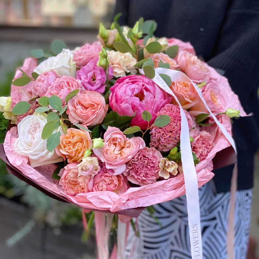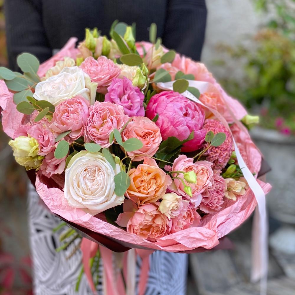 Альстромерия – 3 шт.Лизиантус – 4 шт.Пион – 1 шт.Эвкалипт – 4 шт.Диантус – 7 шт.Роза пионовидная кустовая – 3 шт.Роза пионовидная – 7 шт.Атласная лента – 2 шт.Дизайнерская упаковка – 2 шт.