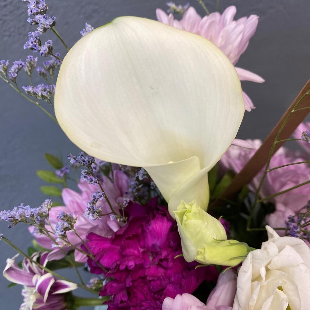 «Лавандовое созвездие» Букет из розы, гвоздики, статица и хлопка