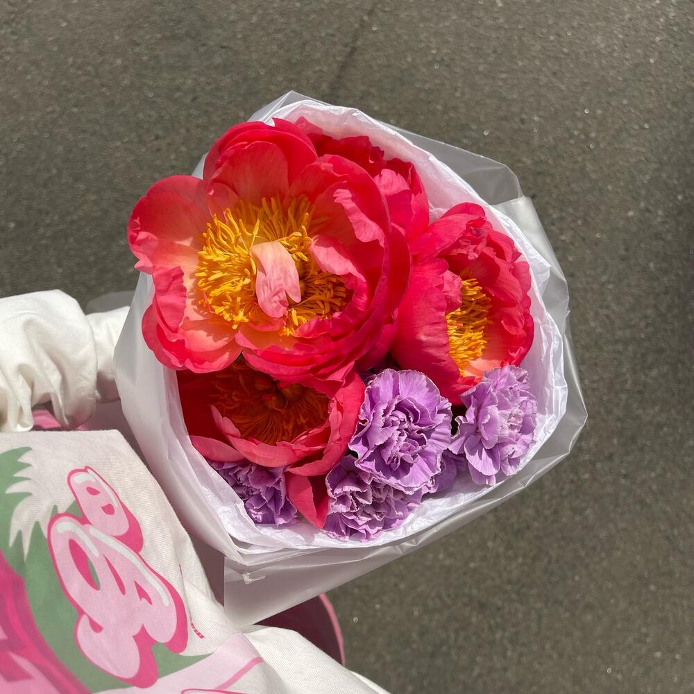 Гвоздика фиолетовая – 8 шт.Лента атласная – 1 шт.Упаковка дизайнерская – 1 шт.Кризал (подкормка) – 1 шт.Пион coral sunset – 5 шт.Аквапак – 1 шт.инструкция по уходу за цветами – 1 шт.транспортировочная упаковка – 1 шт.