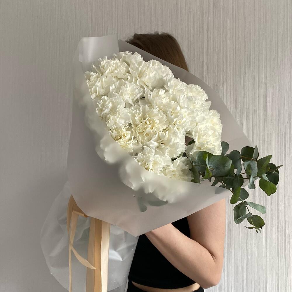 Эвкалипт – 1 шт.Белый диантус – 19 шт.сердце фольгированное с фотографиями – 1 шт.
