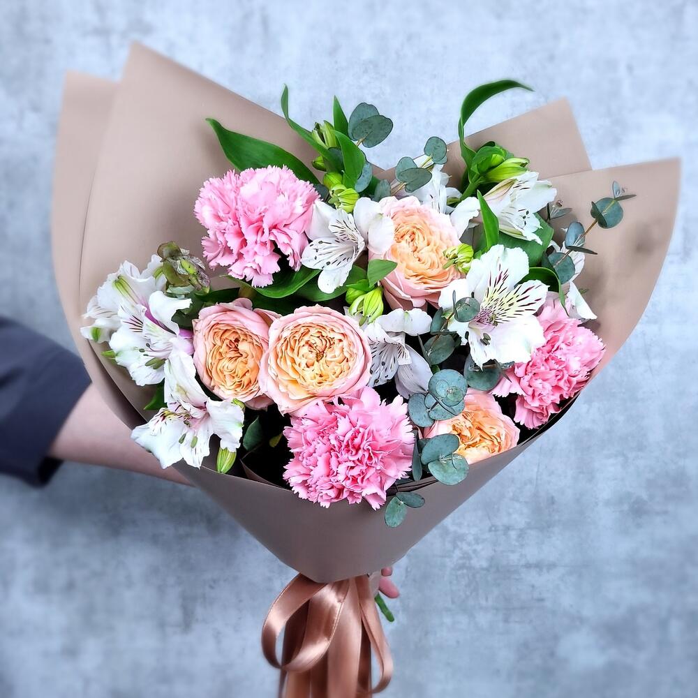 Альстромерия – 3 шт.Эвкалипт – 1 шт.Гвоздика – 3 шт.Роза кустовая пионовидная – 1 шт.Упаковка дизайнерская – 1 шт.