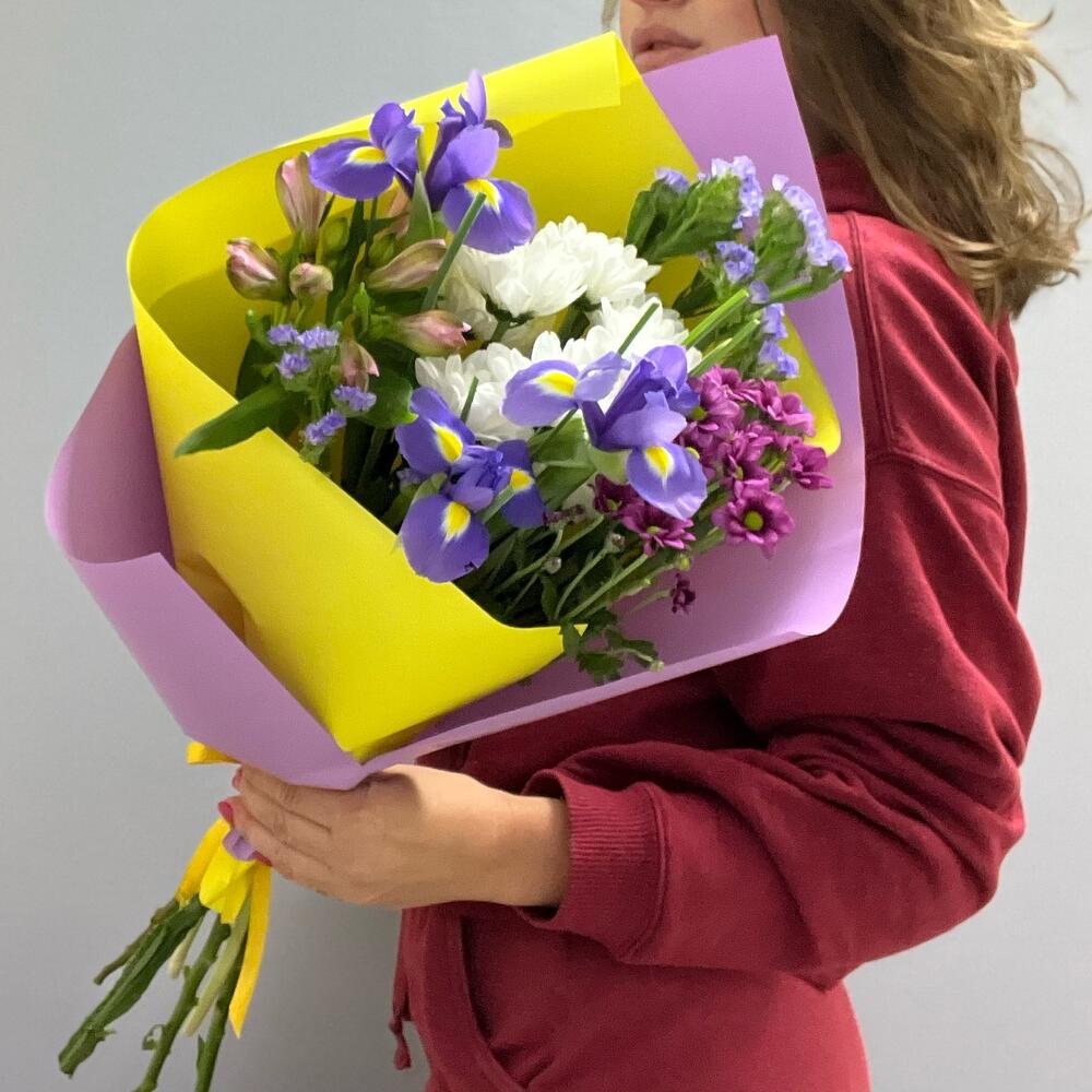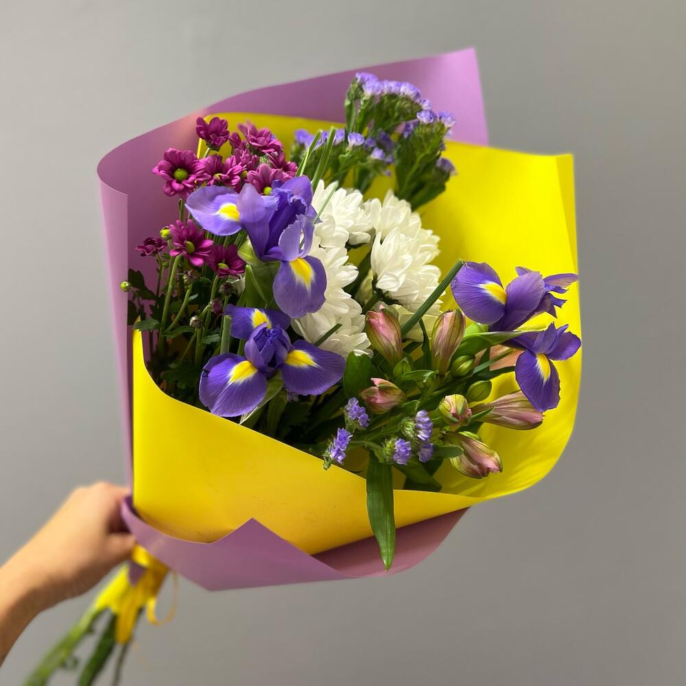 Ирис – 3 шт.Альстромерия – 1 шт.Хризантема кустовая – 2 шт.Статица – 2 шт.Упаковка дизайнерская – 2 шт.Лента атласная – 1 шт.
