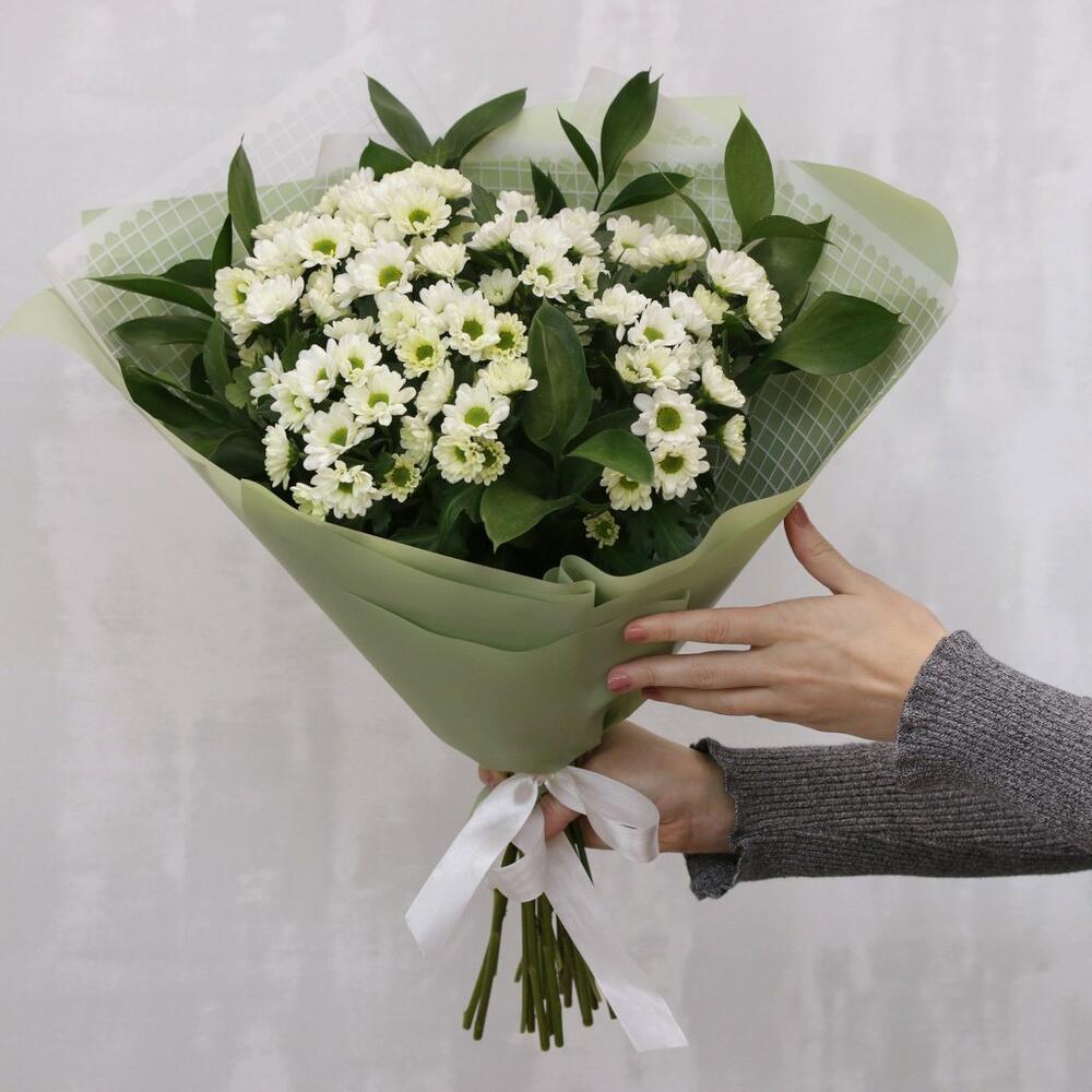 Букет из 11 белых кустовых хризантем Сантини с зеленью